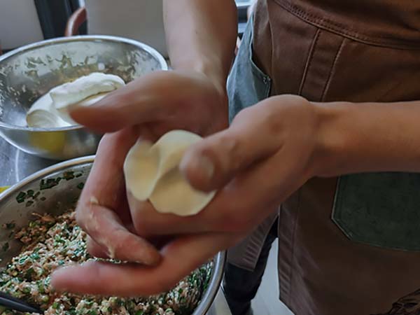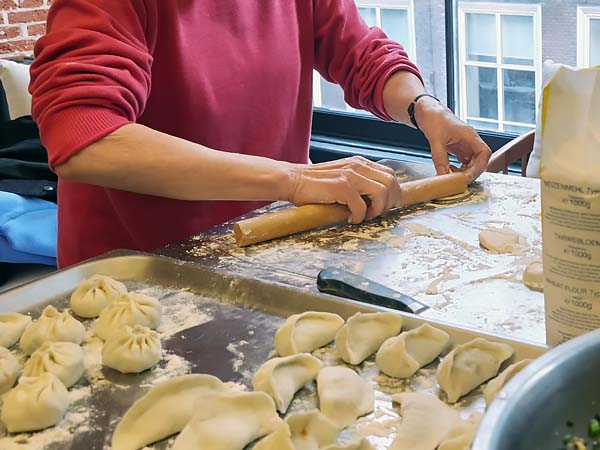 Bij de workshop FYO Dumplings liet de chef-kok van Shandong Cocktails eerst zien hoe je met een Chinese deegroller van kleine stukjes deeg de ronde velletjes van de jiaozi maakt. Vervolgens demonstreerde hij hoe je de vulling daarop legt en het geheel vervolgens dichtvouwt. Daarna nodigde hij de deelnemers uit om het zelf proberen: dat lukte prima! Een deel van de zelfgemaakte jiaozi hebben we meteen klaargemaakt en opgegeten, de rest mocht iedereen mee naar huis nemen.