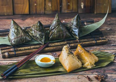 Tijdens het Drakenbootfestival eet je samen met je familie en vrienden lekkere zongzi, in bamboebladeren gewikkelde kleefrijst. De zongzi zijn gevuld met verschillende lekkere dingen: in het noorden van China geeft men de voorkeur aan zoete zongzi, met bonenpasta, jujube en noten. In het zuiden houdt men meer van hartige zongzi, met gemarineerd varkensvlees of gezouten eendeneieren.