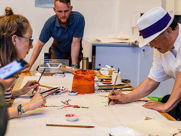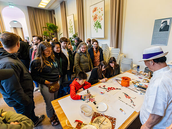 We zijn heel blij dat de beroemde kunstenaars Zhang Qinxian uit Shanghai en Liu Zhijun uit Tianjin naar Nederland waren gekomen om in de Oranjerie demonstraties Chinees schilderen, kalligrafie en zegelsnijden te verzorgen. Al gauw stonden er lange rijen om zelf een schilderij of kalligrafie te maken, of een kalligrafie.